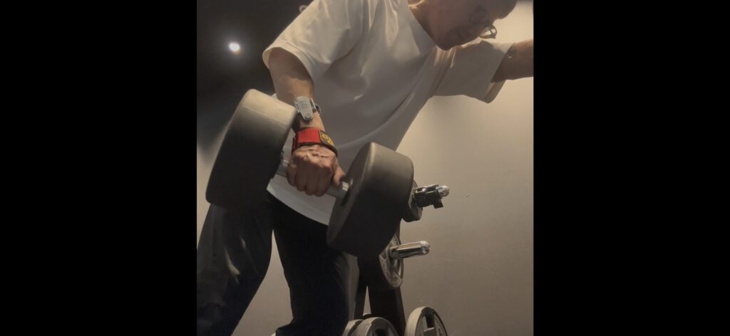 - ベントオーバーロウ広背筋60kg4セット、僧帽筋50kg4セット